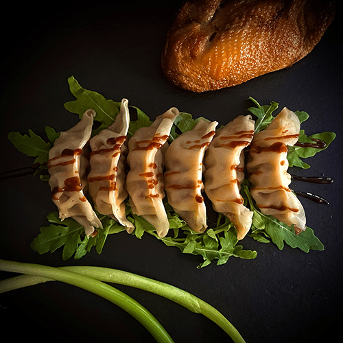 japanische Teigtaschen mit Entenfleisch, Kohl, Zwiebeln, Karotten und Wasserkastanien gefüllt