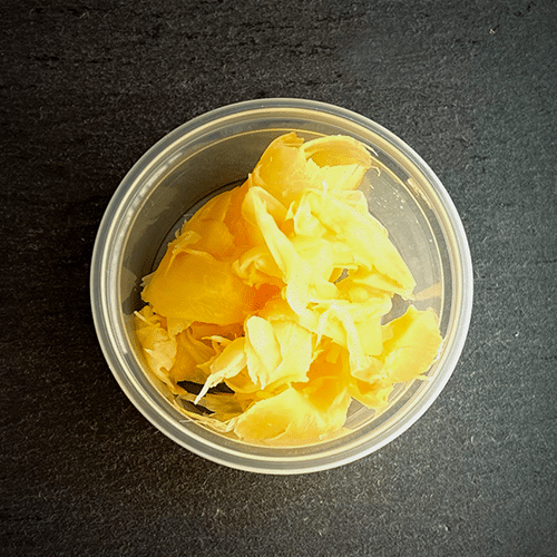 eingelegter Ingwer, in dünnen Scheiben geschnitten