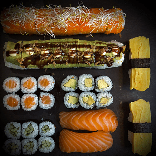 • 6 Lachs Maki• 6 Gurken Maki• 6 Tamago Maki• 2 Sake Nigiri• 2 Sake Aburi Nigiri• 2 Tuna Nigiri• 2 Aburi Tuna Nigiri• 2 Ebi Nigiri• 8 Sake Philadelphia Roll• 8 Let it Roll Gamba & Beef Roll• 8 Spicy Chicken Mango Roll