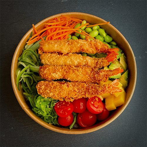 Alle Bowls werden mit Reis, Avocado, Salat-Mix, Cherrytomaten, Edamamekerne, Algensalat, Gurken, Mango, Möhrenstreifen, Teriyaki- und Sesamsauce zubereitet.