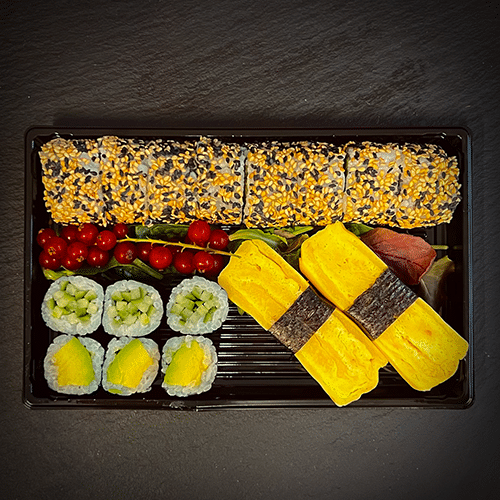 • 6 Lachs Maki • 6 Gurken Maki• 6 Avocado Maki• 2 Lachs Nigiri• 2 Tamago Nigiri• 8 Green Dragon Roll• 8 California Roll